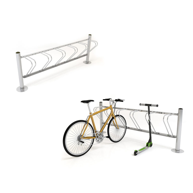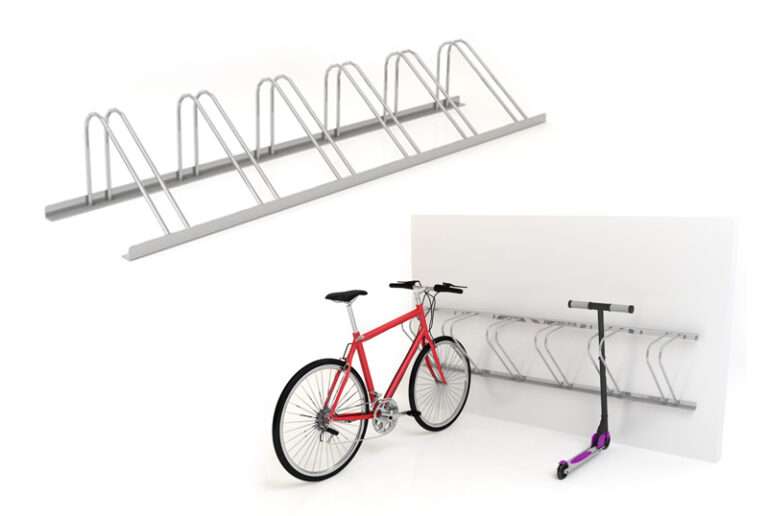 Soporte multiuso, para 6 plazas, fabricado en acero galvanizado, fácil de instalar o trasladar, ideal para guardar bicicletas y patinetes de forma ordenada en residencias, colegios, edificios públicos, etc. que puede instalarse, mediante tornillos, tanto en suelo como en pared.