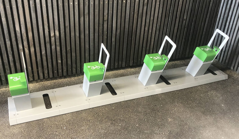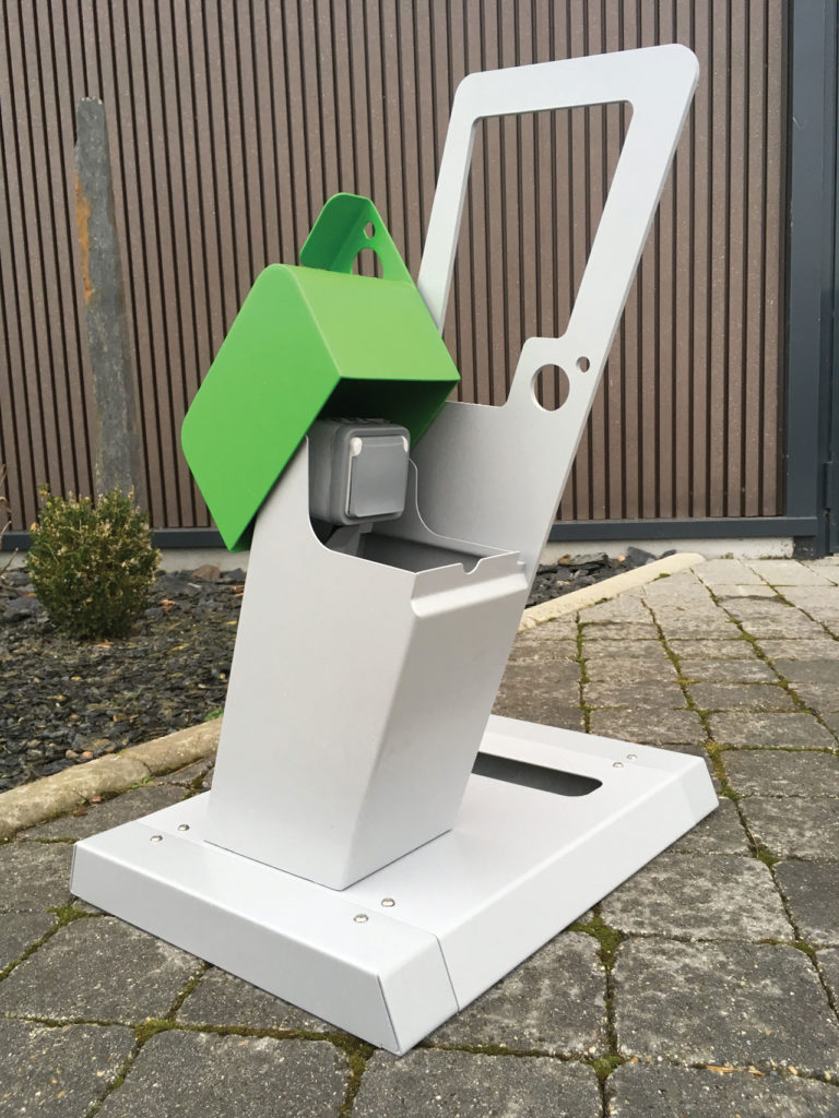 La estación de carga ALTAO® Parco VAE es un aparcabicicletas equipado con un punto de carga para bicicletas eléctricas, que permite guardar el cargador de la bici de forma segura mientras la bici se esta recargando y candar la bicicleta con cualquier tipo de candado.
