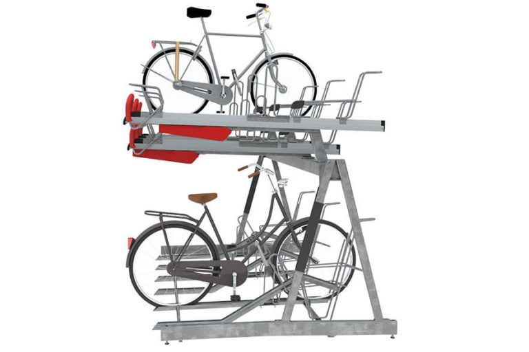 Con marcado CE, garantía Velopa y cumpliendo con los exigentes estándares de la Fundación FietsParKeur, este aparcabicis de doble altura —también conocido como modelo holandés— es la solución perfecta para organizar grandes volúmenes de bicicletas de forma elegante y funcional.