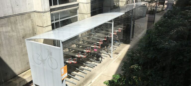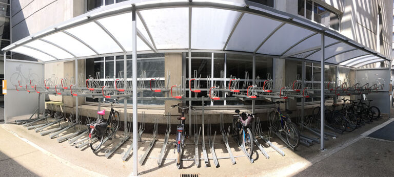 La marquesina para bicicletas ALTAO® Curve Optima es una versión especialmente diseñada para usarse con aparcabicis de doble altura, que permiten duplicar la capacidad.